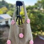 Crafted from soft, premium cotton yarn in a warm oatmeal beige, this slouchy hobo-style bag features an airy open-weave pattern that’s both lightweight and breathable—perfect for spring and summer outings. The real magic lies in the six delicate crochet roses in soft blush pink, each meticulously hand-stitched with tiny green leaves for a romantic, garden-picked touch.