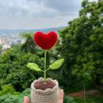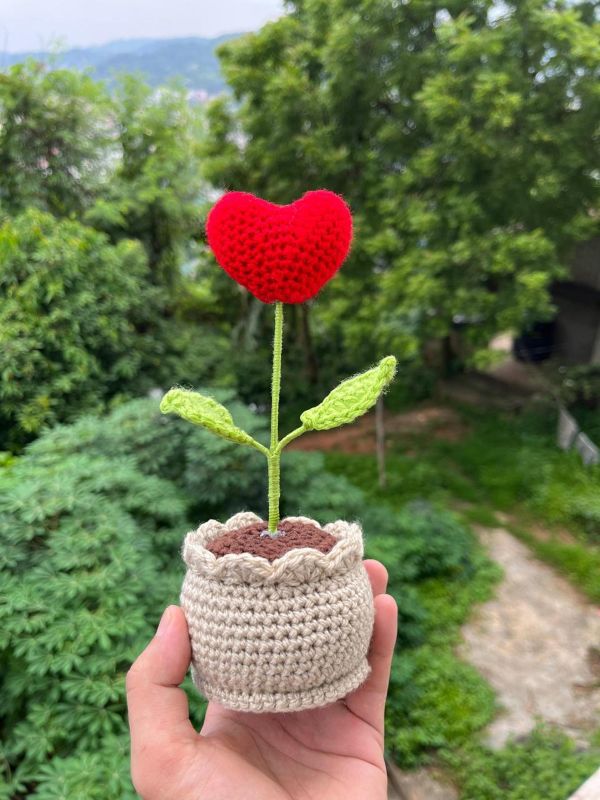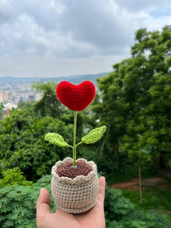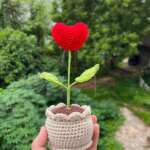 Love that never wilts! ❤️ This adorable hand-crocheted heart-shaped flower blooms bright red on a green stem with two little leaves, happily planted in a tiny beige scalloped pot with realistic brown ‘soil’. A forever-blooming symbol of love. Approx. 7 inches tall. The sweetest desk buddy, Valentine’s gift, anniversary surprise, or just-because hug