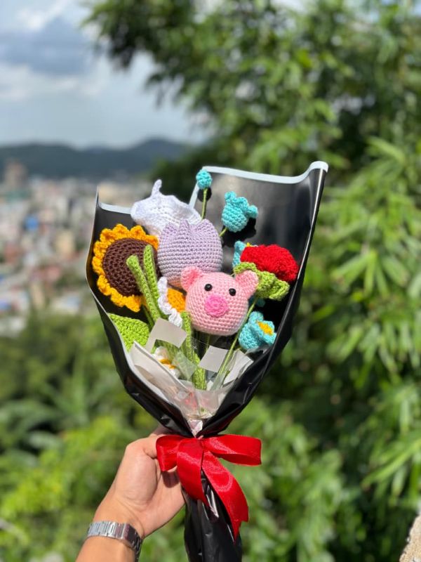 This utterly charming pink piglet has traded its muddy farm for a forever-blooming flower stem. Carefully crocheted with soft, high-quality yarn in delicate pastel pink, each piggy features: