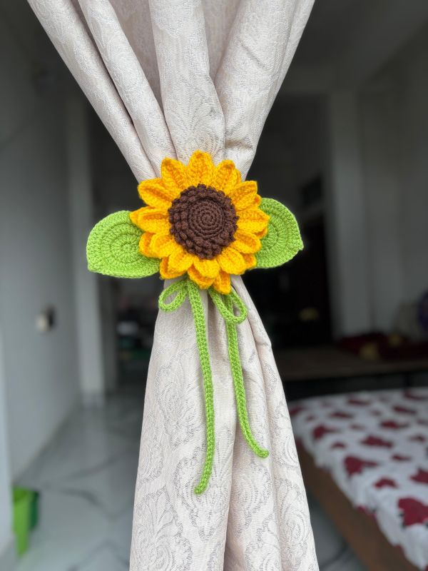 “Handmade crochet sunflower curtain holder – a bright, cheerful way to keep curtains stylishly tied back and add charm to any room.” 🌻
